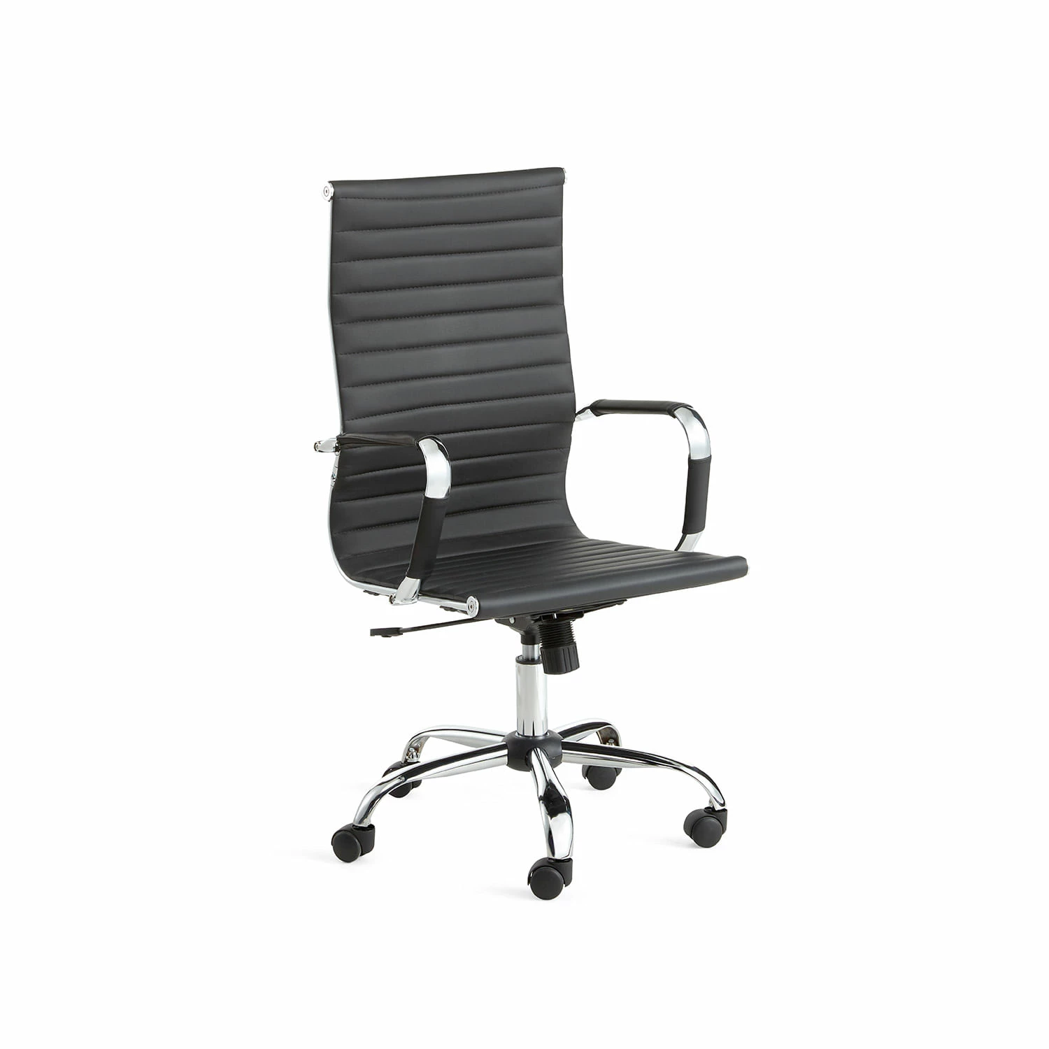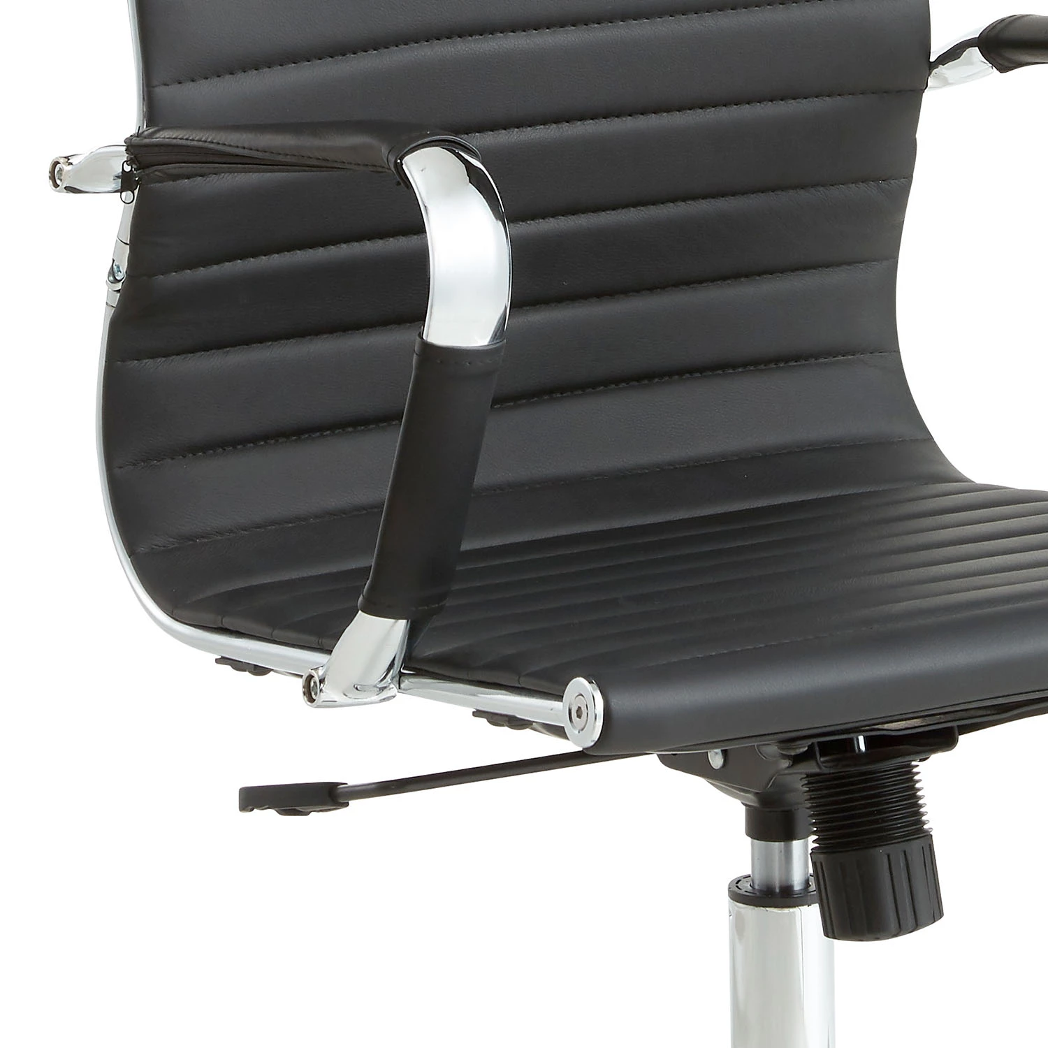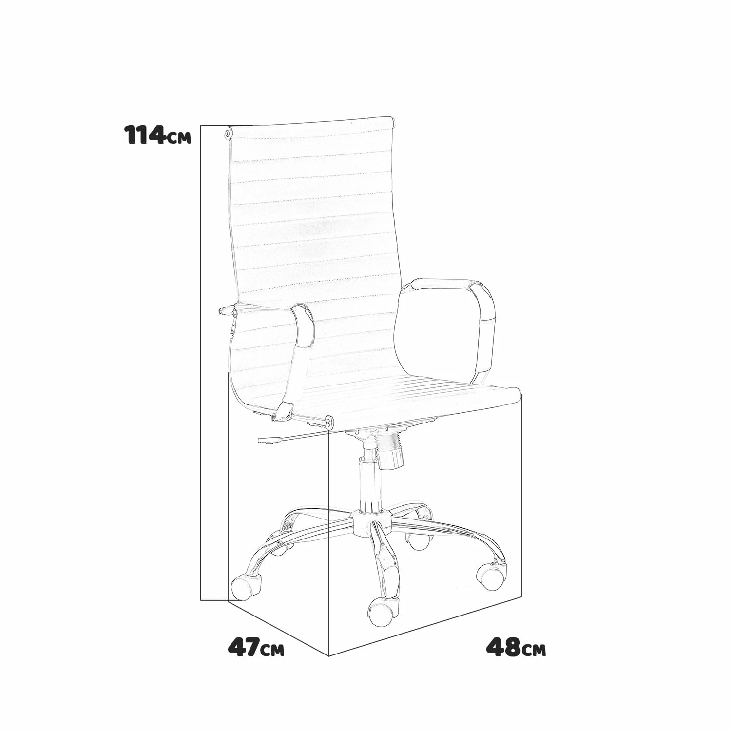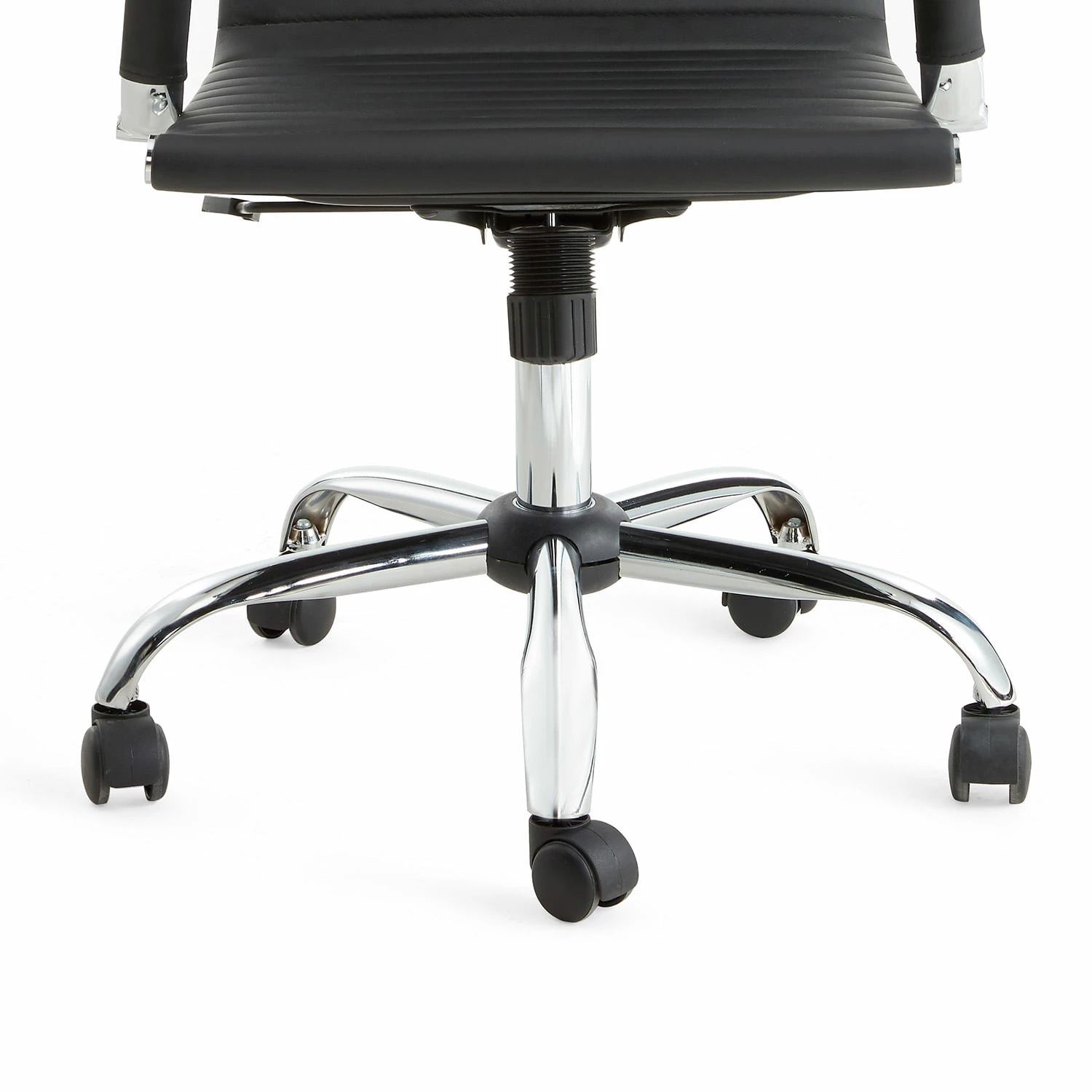 Dispone di una seduta in poliuretano (PU) di alta qualità, trapuntata con cuciture orizzontali, e di una solida base in resistente metallo cromato corredato da ben 5 rotelle multidirezionali in nylon.