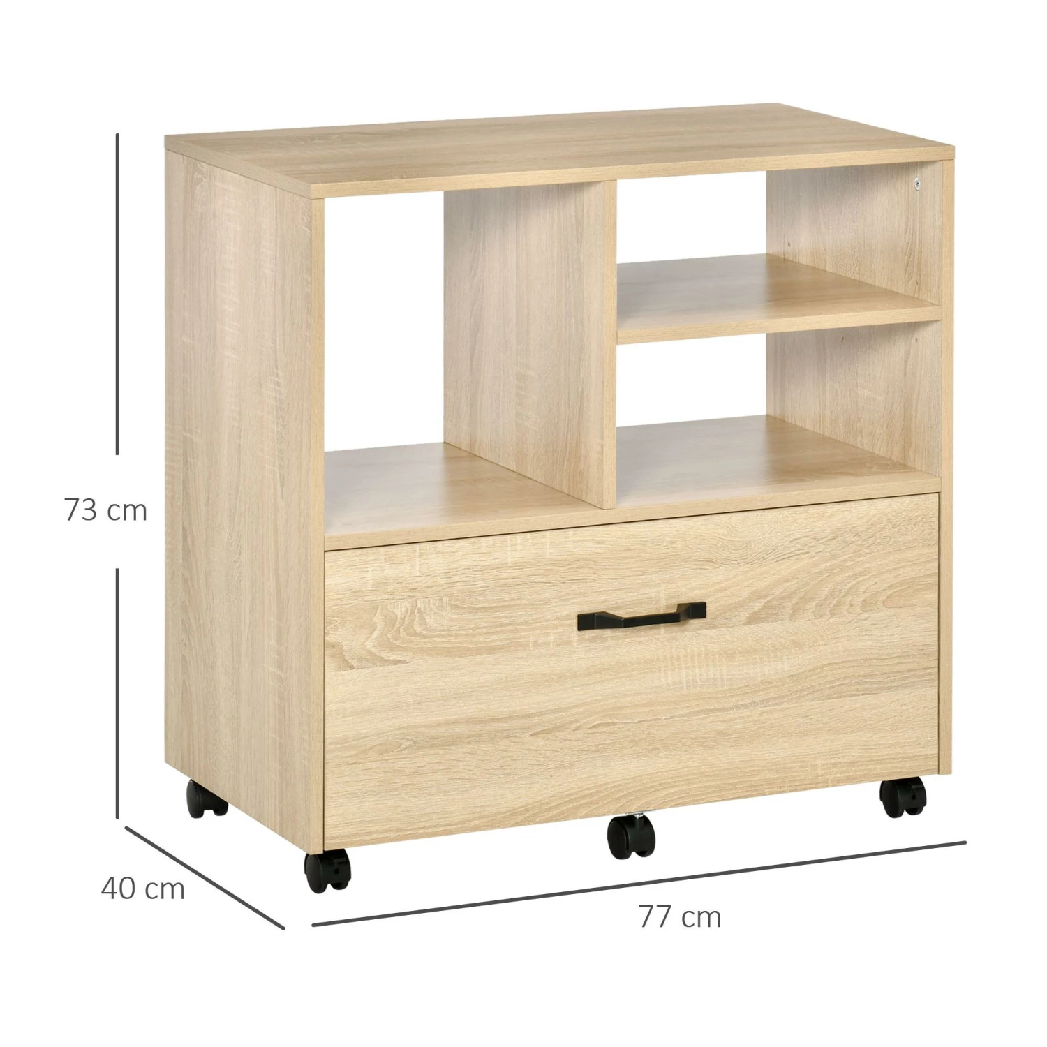 In ufficio hai poco spazio a disposizione? Ottimizzalo con questo mobile multiuso . L’ampio cassetto e i ripiani di dimensione differente ti offrono tante soluzioni per riporre fogli, documenti, cancelleria, scanner e stampante. Inoltre, grazie alle 5 ruote, puoi spostarlo in totale comodità.