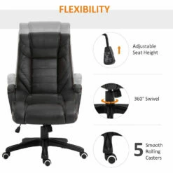 Riunione intensa? Sciogli lo stress con la tua nuova poltrona da ufficio massaggiante! Comoda e robusta, ha un design ergonomico e un look classico, ispirato alle poltrone dirigenziali. La sua imbottitura e il rivestimento in gommapiuma, nascondono 4 punti massaggio nello schienale e 2 nella seduta.
