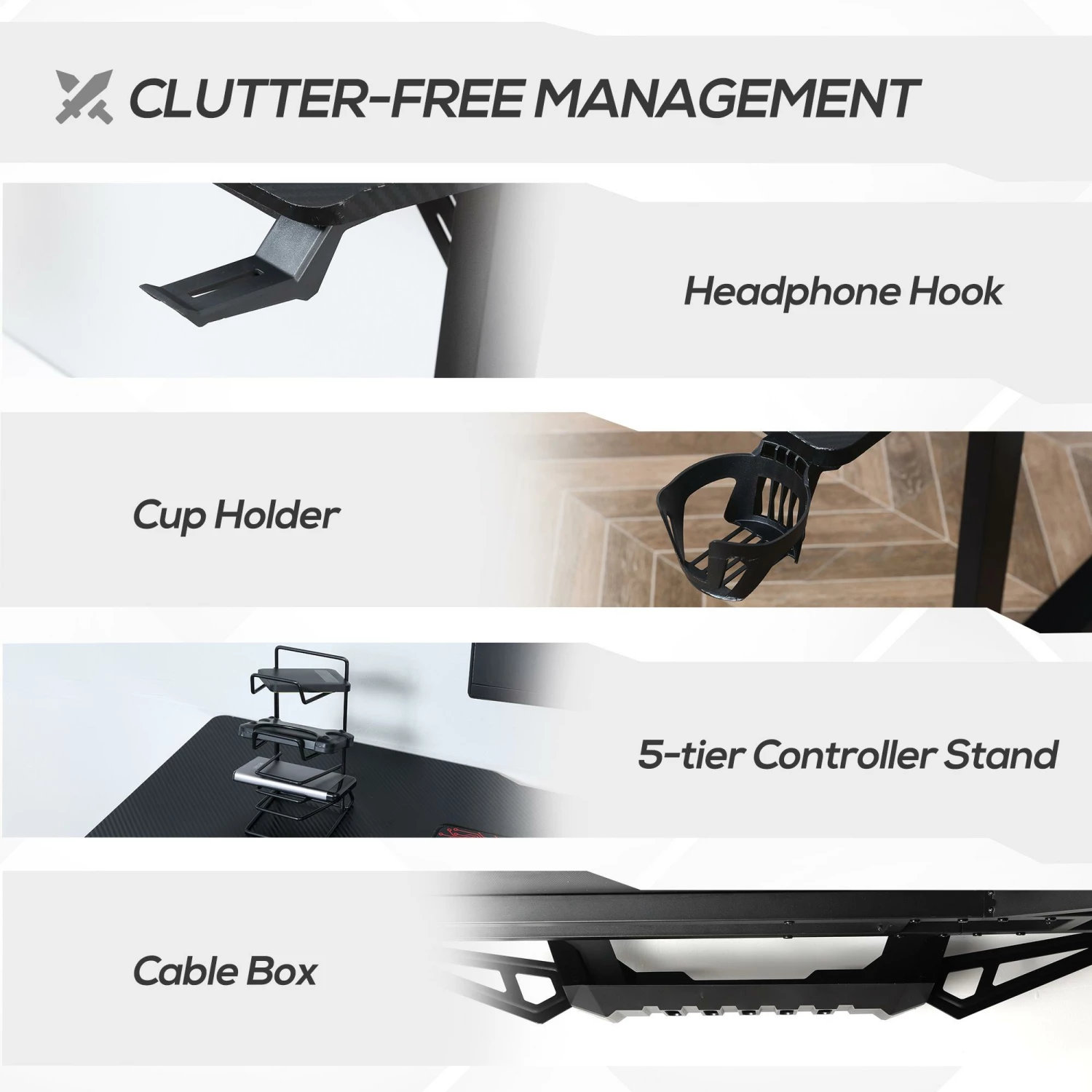 - DESIGN FUNZIONALE: La scrivania gaming è dotata di un pratico porta tazza, gancio per cuffie, supporto per controller a 5 livelli e un sistema di organizzazione dei cavi sotto al piano di lavoro.