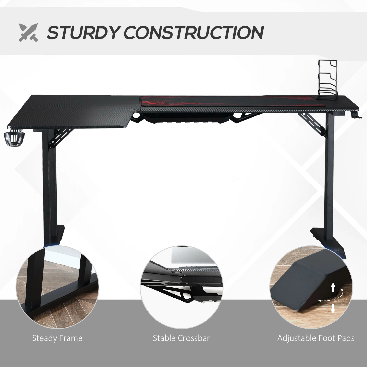 - STILE GAMING: La superficie con effetto fibra di carbonio nera e il tappetino con tonalità rosse rendono questa scrivania per camera e ufficio moderna e accattivante.