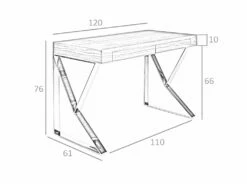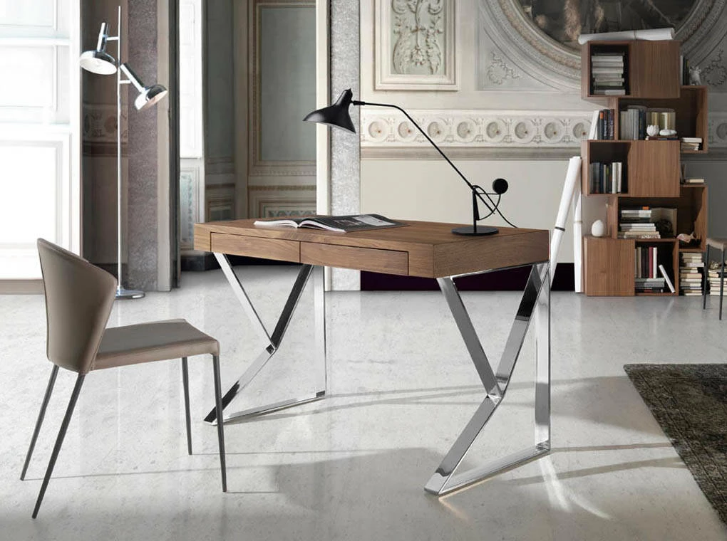 Scrivania da ufficio rettangolare dal design moderno con piano in legno impiallacciato noce naturale spessore 0,5 mm e originale struttura in acciaio inox cromato da 22 micron. Questo tavolo scrivania pratico e funzionale offre anche spazio contenitivo, con due cassetti centrali con sistema di chiusura rallentata. Il suo design originale fornirà quel tocco diverso e unico che stai cercando per il tuo ufficio.