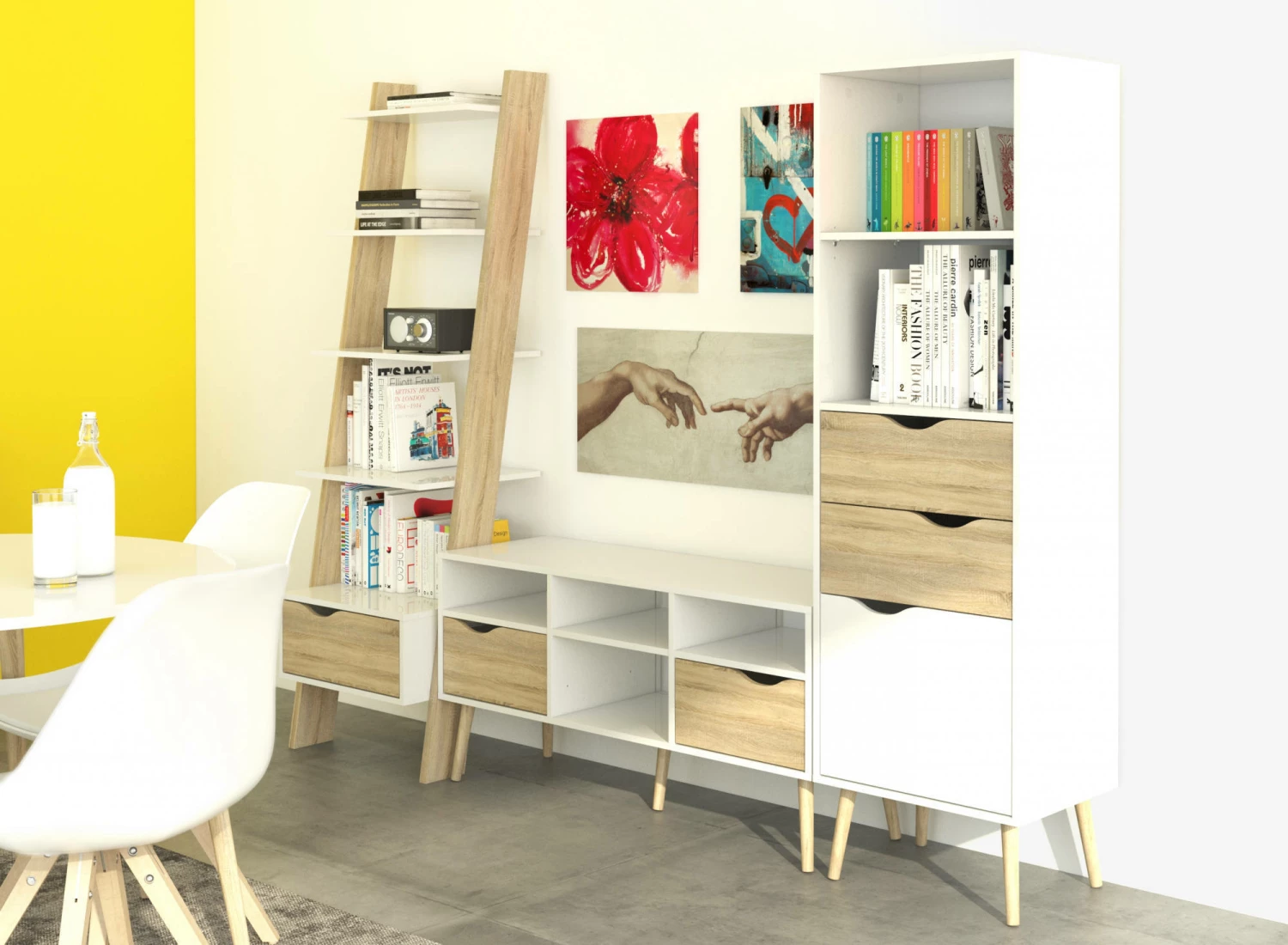 Innovativa scrivania sviluppata in altezza con un piano di lavoro con un vano aperto, un cassetto e un ripiano nella parte alta. La sua struttura è di colore rovere con dettagli di colore bianco, due colori perfetti da accostare in qualsiasi ambiente: la struttura di questa scrivania ricorda una scala, perfetta da collocare in un ambiente casalingo dove si ha necessità di svolgere lavori di ufficio. Le sue linee richiamano lo stile scandì, grazie alla semplicità e all’essenzialità delle sue linee è perfetta da collocare in un ambiente moderno e luminoso. Costruita interamente in foglio melaminico, risulta resistente a urti e graffi ed è durevole nel tempo. Misure in cm: 65 x 180 x 48