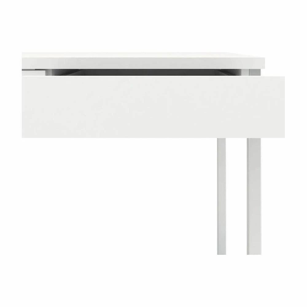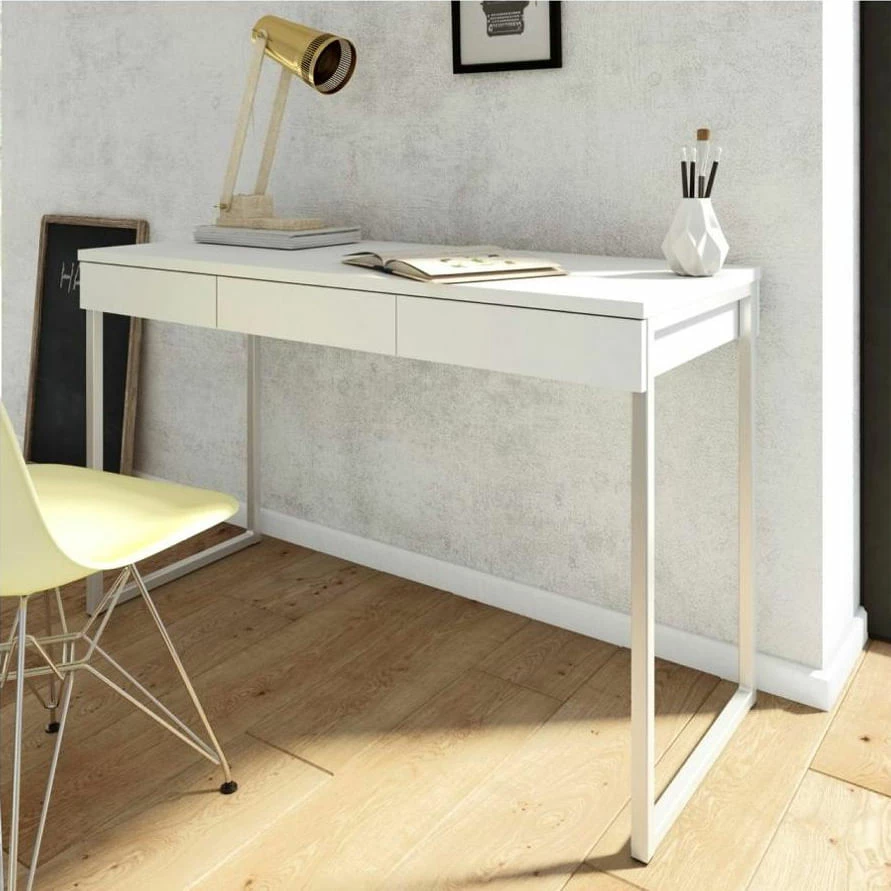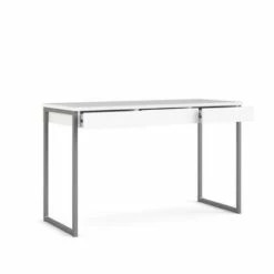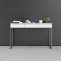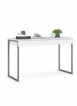 Pratica e funzionale scrivania lineare con tre cassetti con guide in metallo, interamente di colore bianco lucido. E’ perfetta da collocare sia in ufficio che in un ufficio casalingo, grazie alla sua composizione. tre cassetti infatti permettono di avere sempre a portata di mano tutto il necessario al lavoro. Costruita interamente in laminato, risulta resistente a urti e graffi ed è durevole nel tempo. Misure in cm: 125 x 76 x 81.