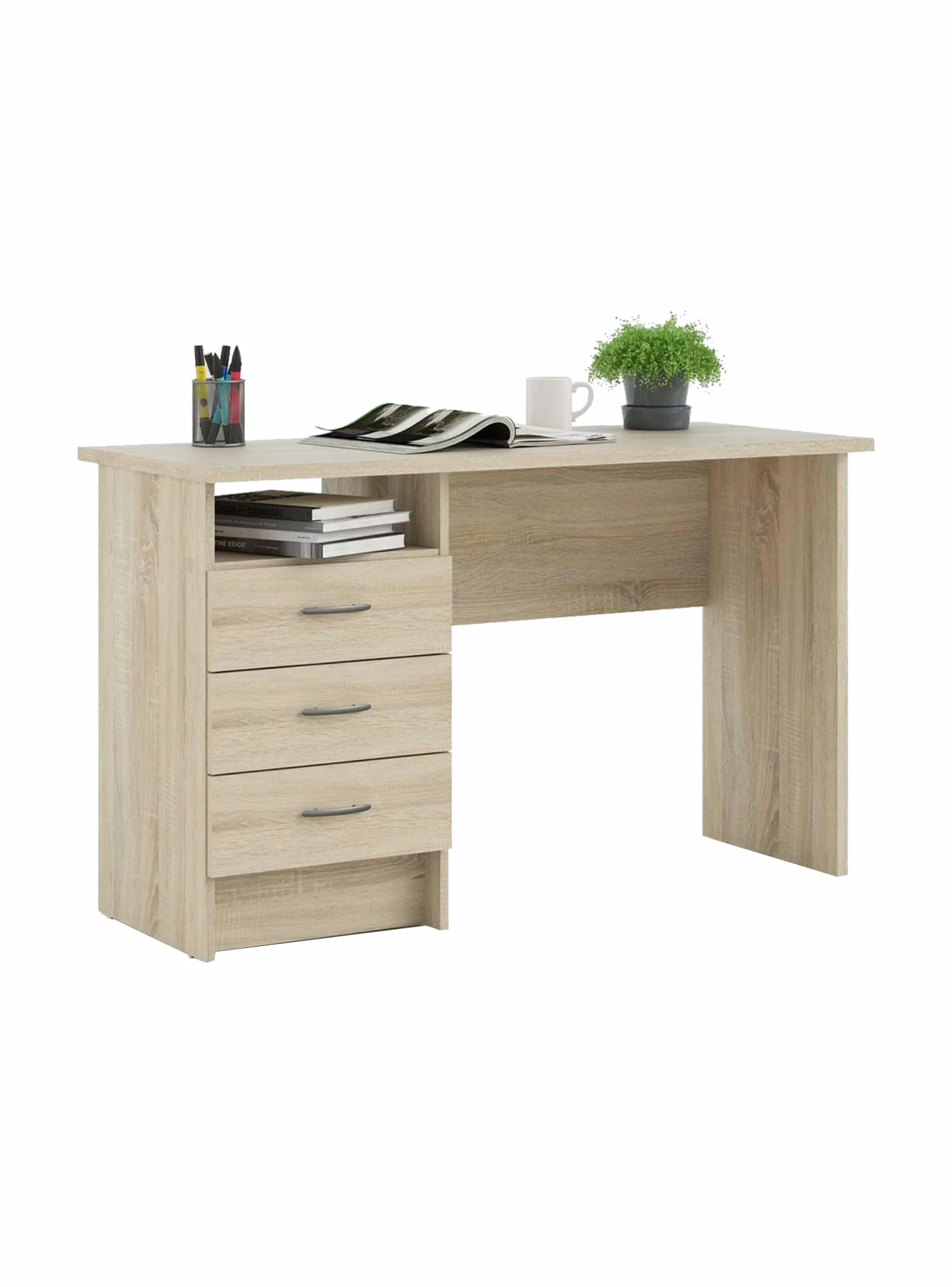 Pratica e funzionale scrivania lineare con tre cassetti con guide in metallo, interamente di colore rovere. Perfetta per essere utilizzata sia in ufficio che a casa come postazione di smart working. I tre cassetti permettono di avere sempre a portata di mano tutto il necessario al lavoro e il vano che si crea tra i cassetti e il piano della scrivania è perfetto per riporre per esempio il computer. La sua struttura in foglio laminato garantisce qualità e durevolezza nel tempo. Misure 120 x 72 x 48 cm