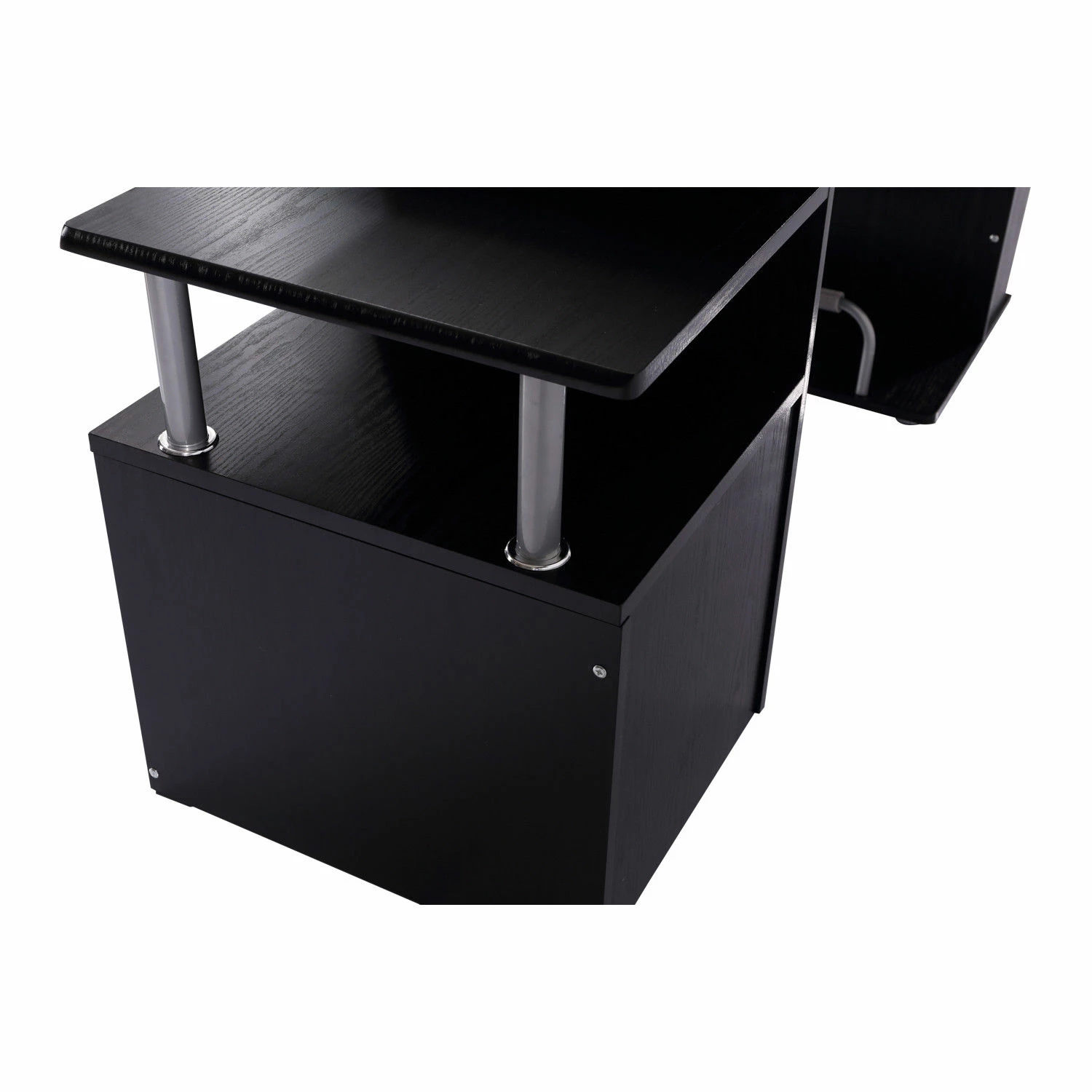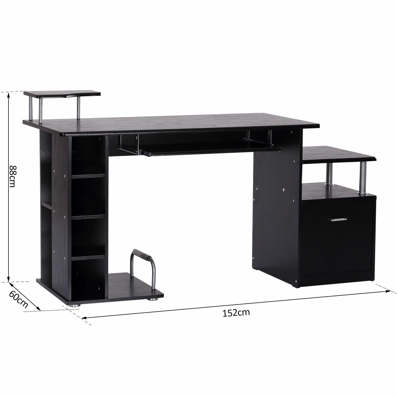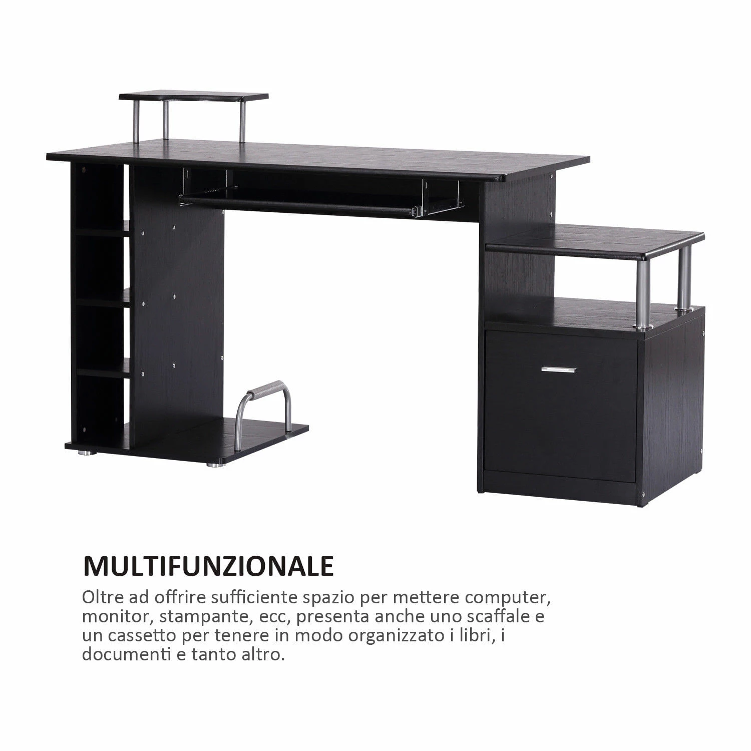 Scrivania per casa o ufficio compatta e funzionale, ideale per i tuoi lavori al computer. Offre sufficiente spazio per mettere computer, monitor, stampante, ecc. Dispone anche di un pratico ripiano estraibile per la tastiera. Oltre a creare un ambiente confortevole per il lavoro e lo studio, presenta anche uno scaffale e un cassetto per tenere in modo organizzato i libri, i documenti e tanto altro.Caratteristiche Scrivania dal design classico e funzionale ideale per l’uso in casa o in ufficio Struttura stabile realizzata in MDF di alta qualità Lavorato con cura, la superficie liscia e omogenea è facile da pulire Offre un piano spazioso da lavoro o da studio Spazio sufficiente per mettere computer, monitor, stampante, tastiera ecc. Pratico vano laterale portaoggetti con 4 ripiani per riporre i tuoi libri, cd, ecc. A destra sono presenti un cassetto alto, un vano e un pratico ripiano Di facile e veloce montaggio con istruzioni incluseDati tecnici Colore: Nero Materiali: Tubo di ferro, E1 MDF Dimensione totale: 152 x 60 x 88cm Area di lavoro: 120 x 60cm Piano per stampante: 32 x 24cm Scaffale per case computer: 22.5 x 50cm Cassetto interno: 36.5 x 32.5 x 35.5cm Carico massimo: 40kg