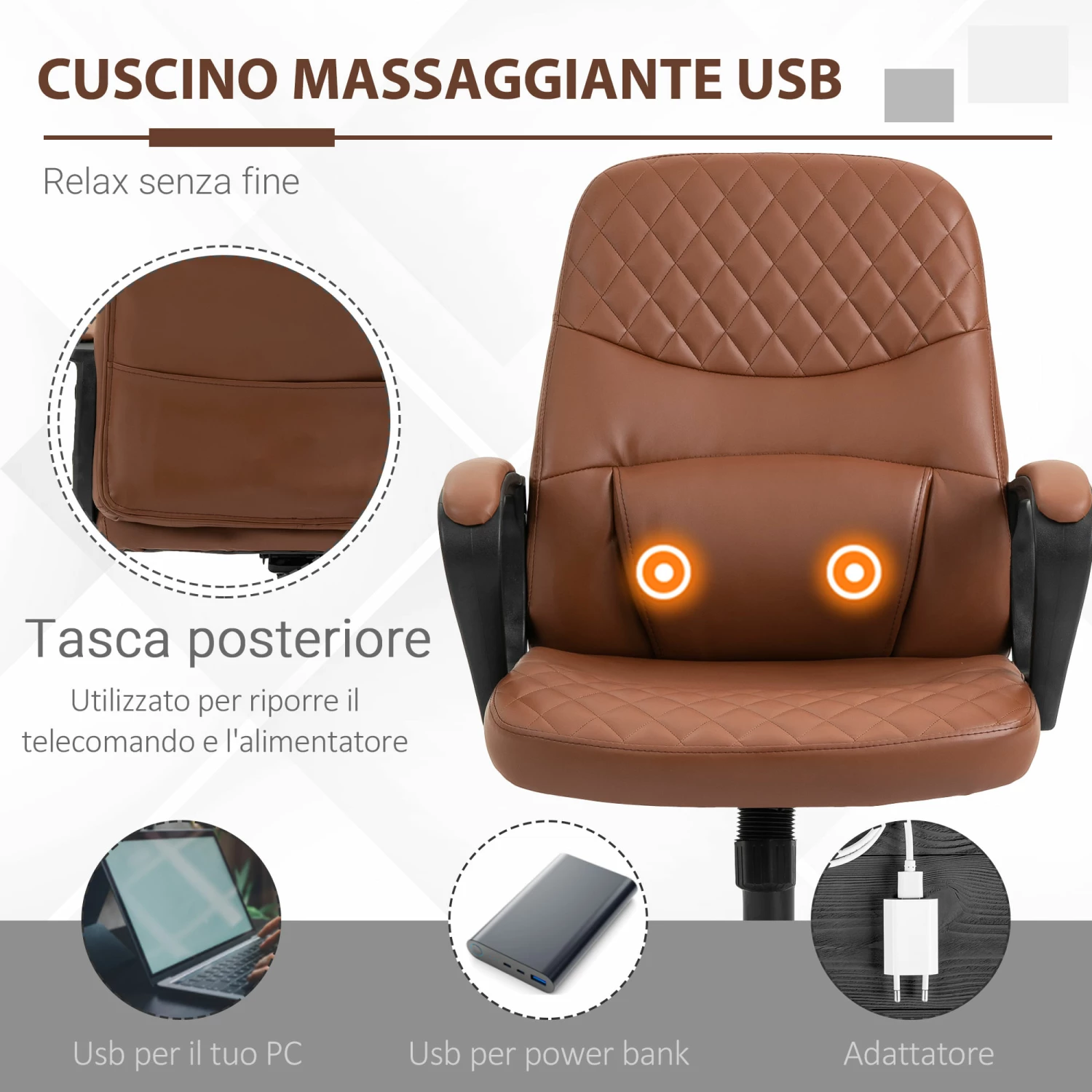 - MASSAGGIO LOMBARE: Nella zona lombare ci sono due punti massaggianti che ti aiuteranno a sciogliere lo stress dopo le riunioni più impegnative. La sedia da ufficio ha una porta USB, che puoi sfruttare per caricare il tuo PC, il tuo tablet o il tuo smartphone.